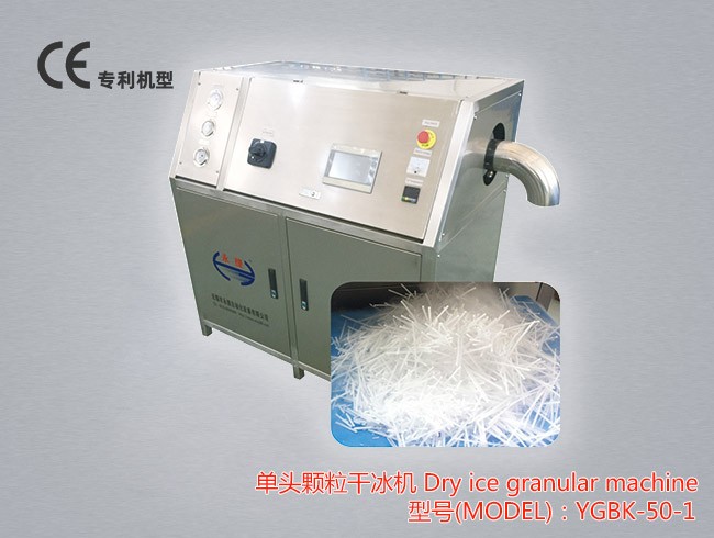 YGBK-50-1 单头颗粒干冰机可以生产Φ3~Φ16mm的高强度颗粒、柱状干冰,生产能力为50公斤/小时。该干冰制造机生产的干冰主要适用于干冰清洗、低温保鲜与冷链运输、烟雾效果等行业。