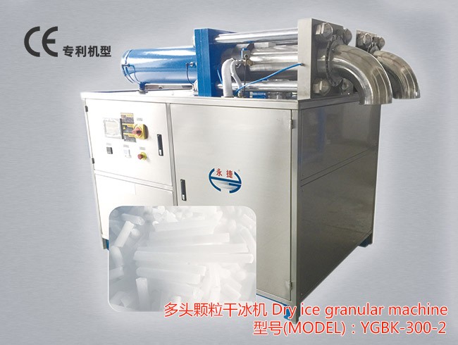 YGBK-300-2双头颗粒干冰机可以生产Φ3~Φ19mm的高强度颗粒、柱状干冰,生产能力为600公斤/小时,产量是颗粒干冰机YGBK-300-1的两倍,节省了占地面积和管道连接。